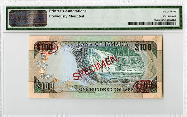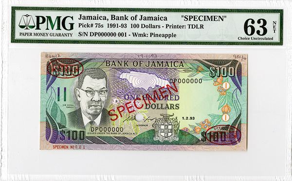 Jamaica, 1-2-93, $100, P-75s, Specimen banknote, S/N DP000000-001, Oval TDLR Specimen overprints and red Specimen overprint, POC, Archival notation UR and UL corner, PMG graded Choice Uncirculated 63 NET with note of previously mounted. TDLR.