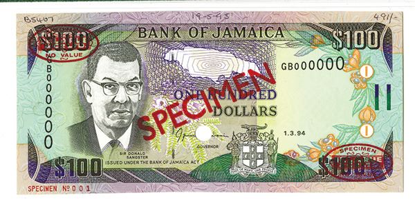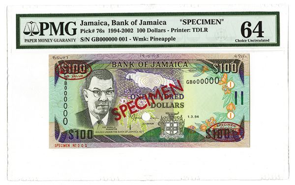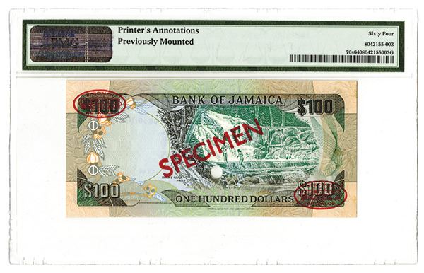Jamaica, $100, P-76s, Specimen banknote, S/N GB000000 - 001, Specimen overprint and oval TDLR Specimen overprints, POC's, Archival notations on margins, PMG graded Choice Uncirculated 64, rare as specimen, TDLR.