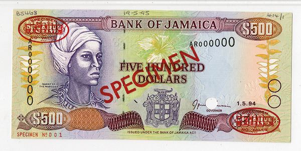 Jamaica, 1-5-94, $500, P-77s, Specimen banknote, S/N AR000000-001, Oval TDLR Specimen overprints and red Specimen overprint, POC, Archival notation UR and UL corner, PMG graded Choice Uncirculated 64 with note of previously mounted. TDLR.