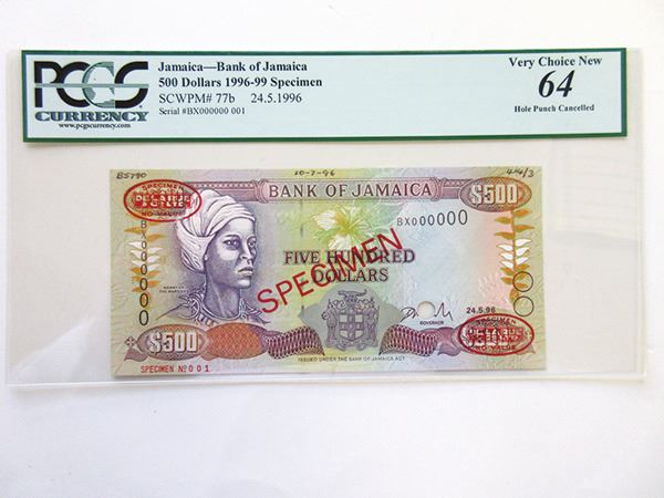 Jamaica, $500, P-77b, Specimen banknote, Brown on m/c, Woman at left, Arms middle, flower top middle, Oval TDLR Specimen overprints in red on top left and lower right with large Specimen overprint, S/N BX000000-001, Archival notations on top margins, PCGS graded Very Choice Unc. 64, Note of light adhesive on back, Attractive and scarce note.