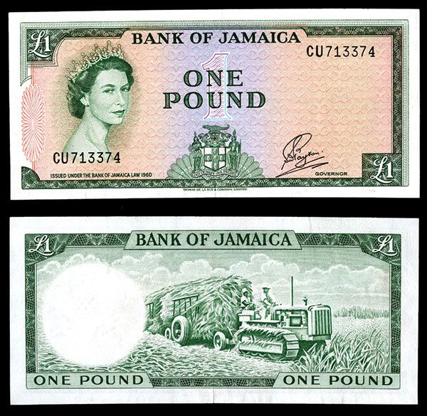 Lot of 3 issued notes, Includes L.1960 (1964), 5/-, P-51Ad, English Motto with signature 1, the note appears Choice Unc. but there is a preprinted paper fold on the lower right corner as the only detracting mark, but please evaluate, otherwise this note grades Choice AU; L.1960 (1961), 10/-, P-50, Latin Motto with signature 1, Uncirculated; and, 1 Pound, P-51Ca, Issued banknote, English Motto, Signature 1, Queen Elizabeth II on left, Green on m/c, back green, AU to Uncirculated Condition, this note is also the Pick Plate note in the SCWPM. Attractive Jamaican trio of notes.