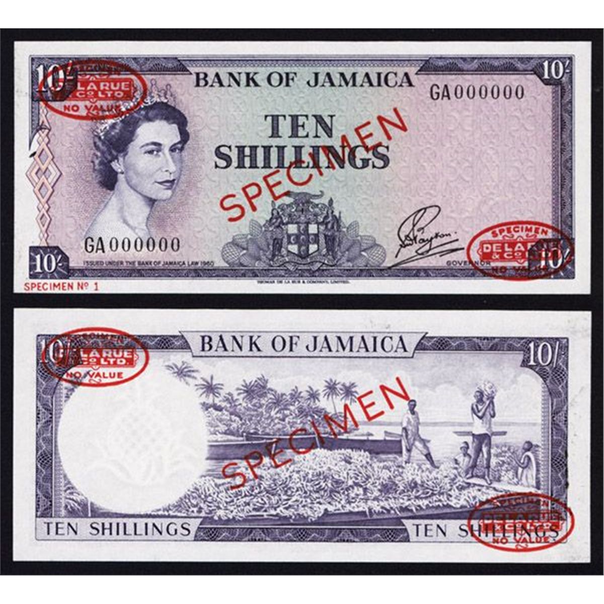 Jamaica, ND (1961), 10 /- Shillings, P-50s, Specimen banknote, Queen Elizabeth II on left, Purple on m/c, back purple, AU to Uncirculated Condition, back has light mounting remnants on right margin, S/N GA000000, oval T.De La Rue Specimen overprints on upper left and lower right, TDLR.