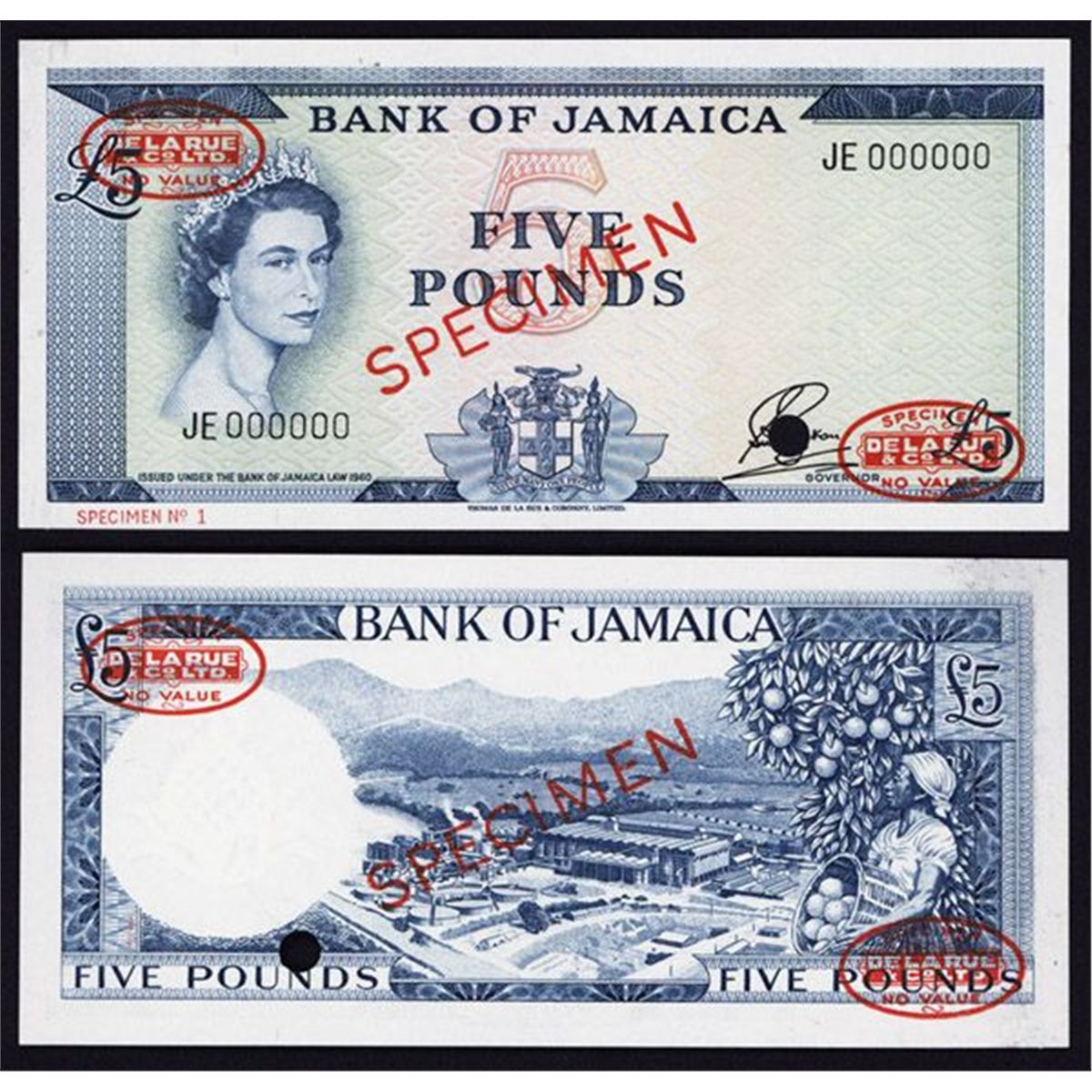 Jamaica, L. 1960, 5 Pounds, P-52bs, Specimen banknote, Queen Elizabeth II on left, Blue on m/c, back blue, AU to Uncirculated condition, back has light mounting remnants on right margin, S/N JE 000000, oval T.De La Rue Specimen overprints on upper left and lower right, TDLR.
