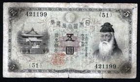 ND (1916). 5 Yen. P-35. Issued banknote. Serial #421199, Block #51. Black on light green underprint, back brown. Ube Shrine on left and portrait of Sukune on right. VG condition.