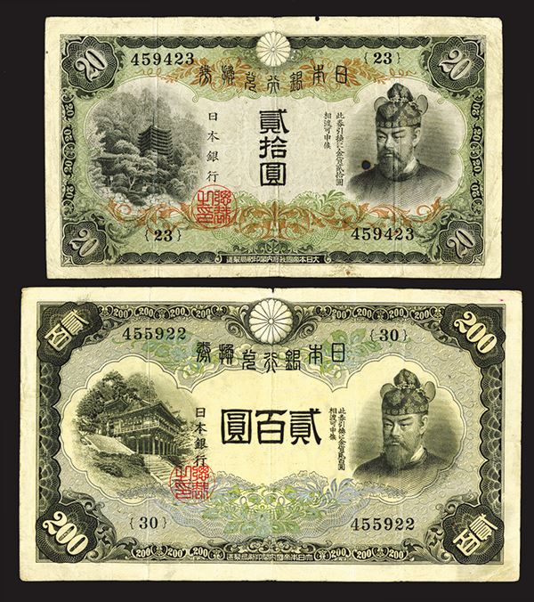 Japan, Lot of 2 notes, Includes 1931 ND, 20 Yen, P-41a, VF and 200 Yen, P-44a, Issued banknote, Black on gray and green underprint, S/N 455922, Block 30, Appears VF to Choice VF but there are two small areas of tape reinforcement on the back, on the lower left corner and the top middle margin, attractive for issue. Nice Japan banknote pair.