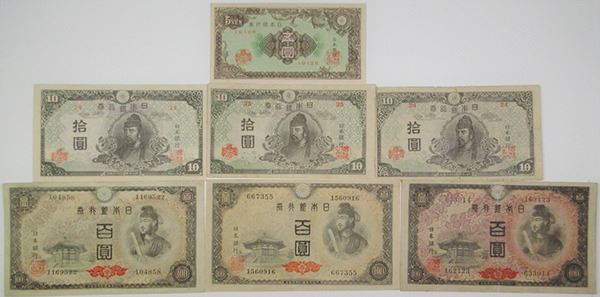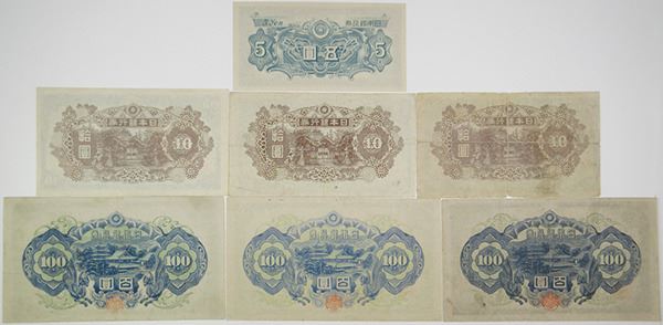 Japan.... Lot of 7 notes, includes a septet of 5 Yen, 10 Yen, and 100 Yen notes. P-77a (3); 86; 89a; 89b (2). Generally VF. Sold "As is" no returns accepted for group lots. (7)