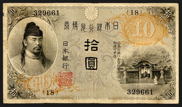Japan, 10 Yen, P-36, Issued banknote, Portrait #5 at left, Goo Shrine at right, Block 18, S/N 329661, PMG graded Very Fine 25, attractive banknote for grade.