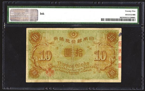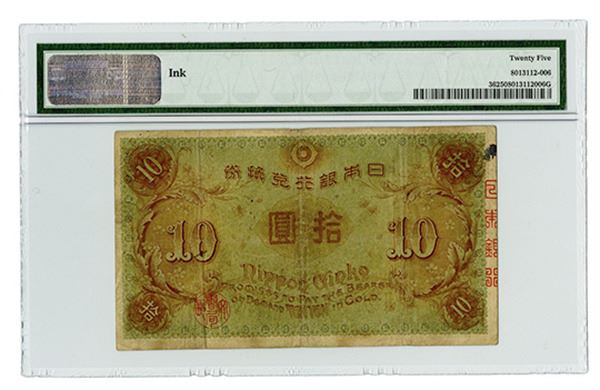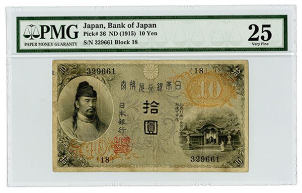 Japan, 10 Yen, P-36, Issued banknote, Portrait #5 at left, Goo Shrine at right, Block 18, S/N 329661, PMG graded Very Fine 25, attractive banknote for grade.