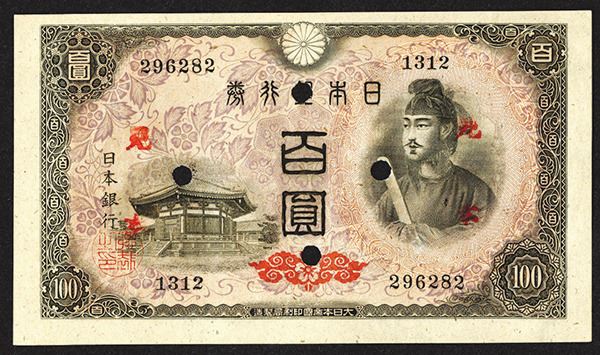 Japan. 100 Yen, P-57s2 with four red small Mi-hon overprint. poc. Choice Uncirculated.