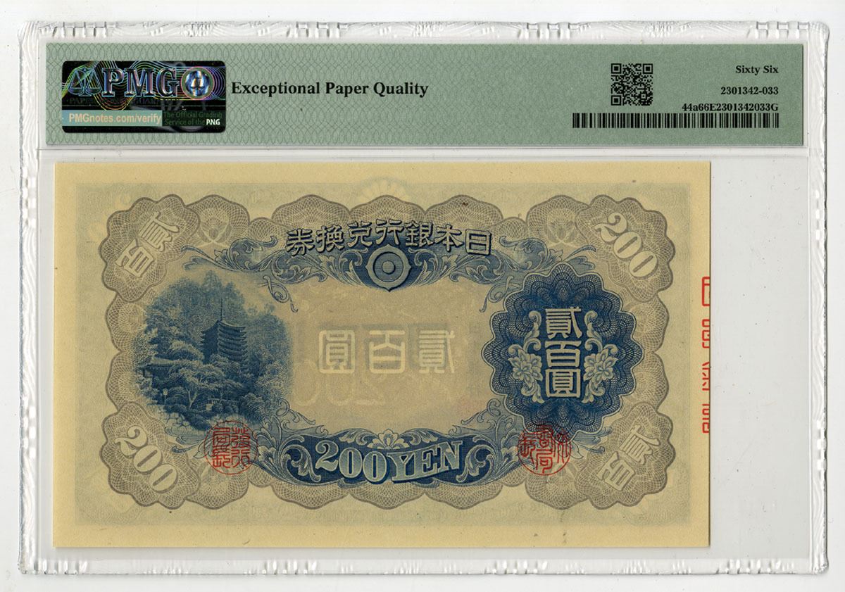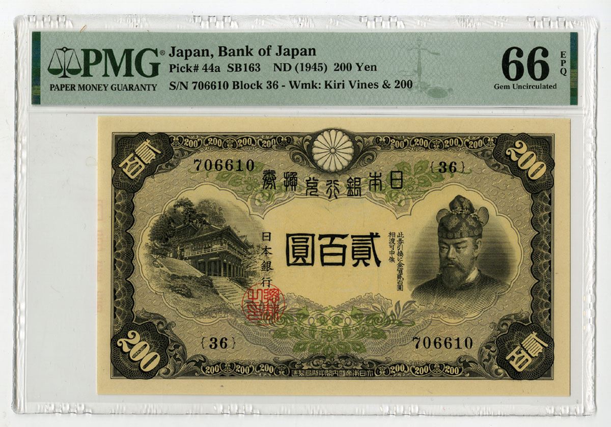 Japan, ND (1945). 200 Yen, P-44a, Issued Banknote, Black on gray and green underprint with Danzan Shrine at left and Portrait #4 at right, Back is blue and gray, S/N 706610 Block 36, PMG graded Gem Uncirculated 66 EPQ. Only 5 notes graded in the PMG census are 1 increment higher out of a total of 438 notes graded.
