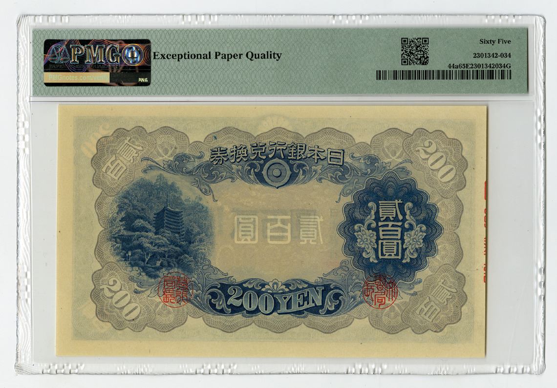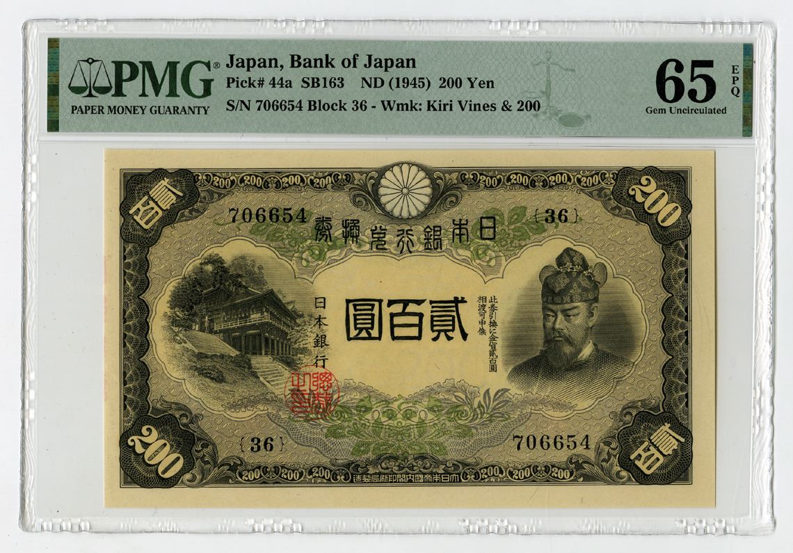 Japan, ND (1945). 200 Yen, P-44a SB163, Issued Banknote, Black on gray and green underprint with Danzan Shrine at left and Portrait #4 at right, Back is blue and gray, S/N 706654 Block 36, PMG graded Gem Uncirculated 65 EPQ.