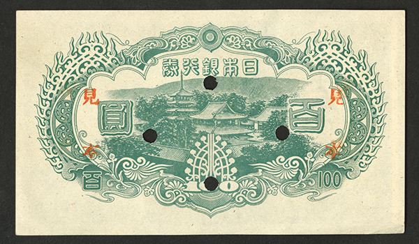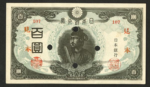 Japan, 100 Yen, P-78As2, Small Mihon overprint in red on face and back with 4 POC's in middle, Block 107, AU to Choice AU condition. Attractive and scarce note.