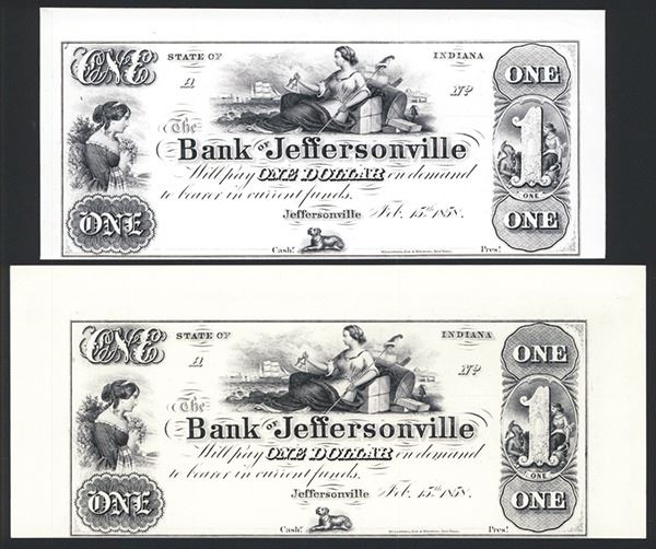 Jeffersonville, Indiana. Lot of 2 notes, 1858 (ca.1960-70's), 2 examples of the $1 on different colored paper, white paper and light cream paper, (IN-280-G2a), Modern "Proprietary Proofs". The proof has woman holding flowers on left and seated allegorical woman with ships in middle, Choice to Gem Uncirculated condition. WH&W. Archival "Proprietary" proofs. (ABN Commemoratives, AIA XI, May 15, 2012)
