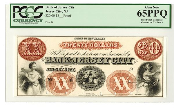 Jersey City, New Jersey. 1856 (ca.1850's), $20, Proof Obsolete Banknotes, Haxby NJ-250-G2a, Black on red-brown, Allegorical young women lower left and right under denomination medallions with arms in middle. Printed on india paper on thin card, PCGS graded Gem New 65 PPQ, DW&C. Rare note with only 3 proofs found and offered in the historic 1990 ABN-Christies Obsolete Banknote Auction. This is a rare opportunity to obtain a spectacular example from this bank. Rare and attractive note.