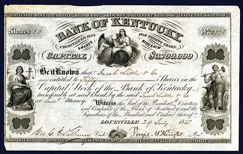 Kentucky, 1850, 50 Shares, Issued Stock, Woman with Bald Eagle, flag and globe top center, VF condition, Toppan, Carpenter & Co.