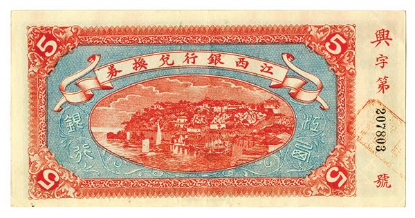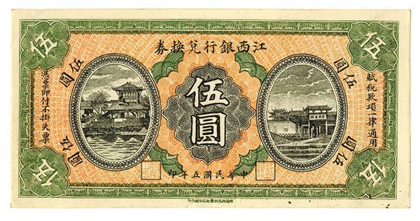 Kiangsi, China. 1916 "Bank of Kiangsi". $5 Exchange Coupon, P-S1101, (S/M #C102-11), Issued banknote, green and orange, pavilion on left and tower at right, back with village along shoreline in red and blue with red seal on right, S/N 207803, AU condition. Very clean and remarkably fresh. Beautiful, sharp, vivid colors, in a quality which is rarely encountered.