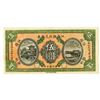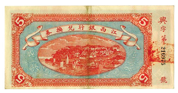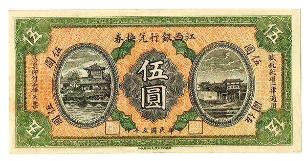 Kiangsi, China. 1916 "Bank of Kiangsi". $5 Exchange Coupon, P-S1101, (S/M #C102-11), Issued banknote, green and orange, pavilion on left and tower at right, back with village along shoreline in red and blue with red seal on right, S/N 216975, AU condition. Very clean and remarkably fresh. Beautiful, sharp, vivid colors, in a quality which is rarely encountered.