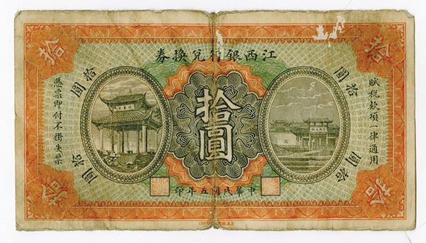Kiangsi, China. 1916 "Bank of Kiangsi". $10 Exchange Coupon, P-S1102, (S/M #C102-12), Issued banknote, Orange and m/c, Tower on left and right, back with village along shoreline in red and blue with red seal on right, S/N 60445, Fine to Choice Fine condition. The face shows wear and soiling as well as 2 small thins, the back with bright colors. Scarce denomination. CMPA.