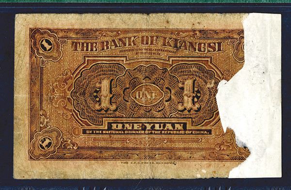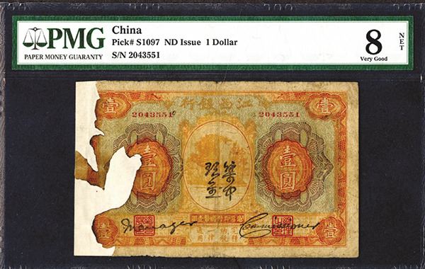 1 Yuan, P-S1097 (S/M#C102-1), Issued banknote, Orange on m/c, back brown, PMG graded Very Good 8 NET with note of pieces missing, paper added, Rare note in any condition with this being the only example graded by PMG.
