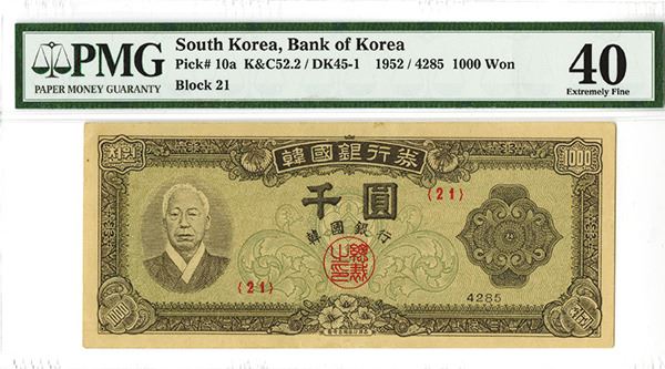 South Korea, 1952, 1000 Hwan, P-10a K&C52.2 / DK45-1, Issued banknote, Syngman Rhee at left, Block 21, PMG graded Extremely Fine 40, attractive note for grade.