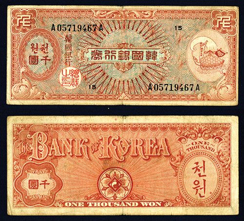 1000 Won, P-15a (K&C52.5 / DK46-1), Issued banknote, Brown-orange on m/c, Medieval tortoise warship at left, S/N A 05719467 A, Block 15, PMG graded Very Fine 20, Attractive note.