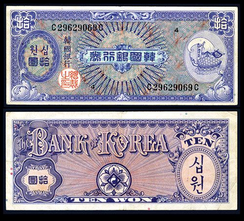 South Korea, 10 Won, P-13, Issued banknote, pp 4, S/N C 29629069C, Choice VF with one vertical fold keeping this note from Choice XF.