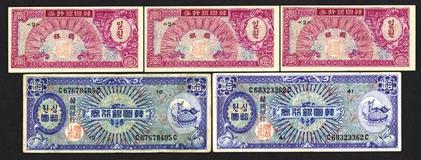 South Korea. 1, 10 Won. SCWPM 11a (3) Very Fine; 13 (2) Very Good-Fine. 5 pieces..