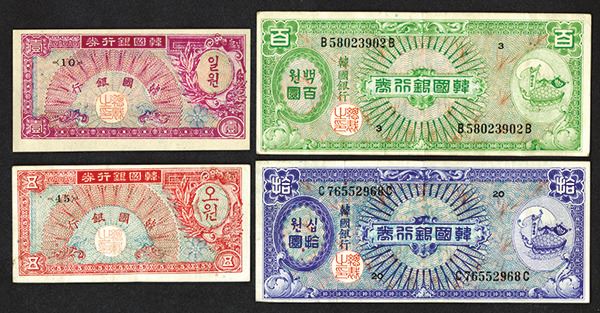 South Korea. 1, 10, 100 Won. P-11b; 12, 13, 14. Choice Very Fine to EF. 4 pieces.