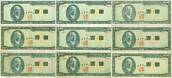South Korea, Lot of 9 notes, all are 100 Hwan issued notes, P-19a (2); P-19b (4) and P-19c (3), all are Choice Fine to Choice VF. Attractive assortment. (9).