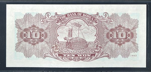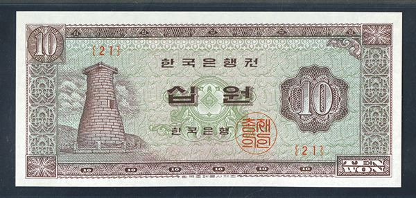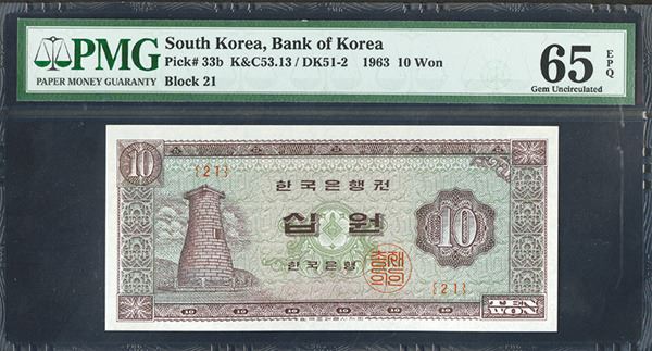 South Korea. 10 Won, P-33b, K&C53.13 / DK51-2, Issued banknote, Block 21, brown on lilac and green, tower at left, PMG graded Gem Uncirculated 65 EPQ.