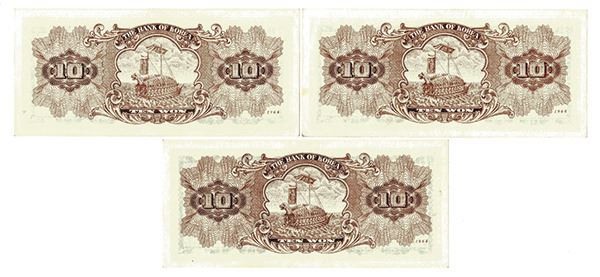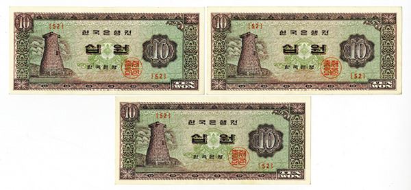South Korea. Lot of 3 notes, All are 1964, 10 Won, P-33c, Issued notes, all block (52), All are AU to Choice AU condition.