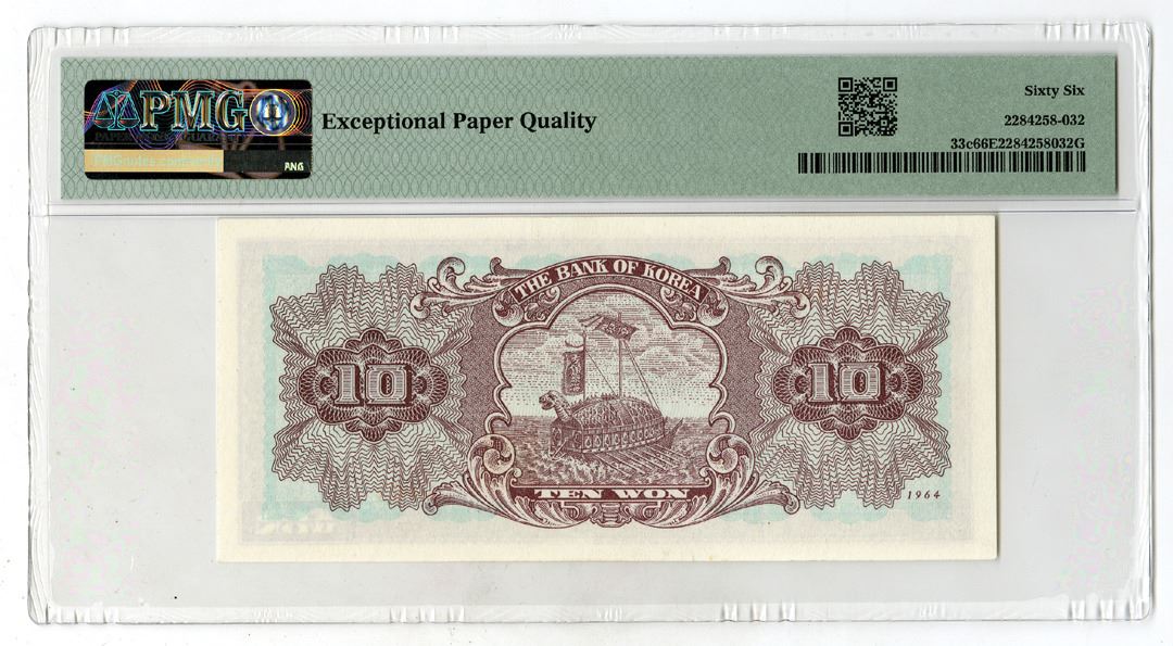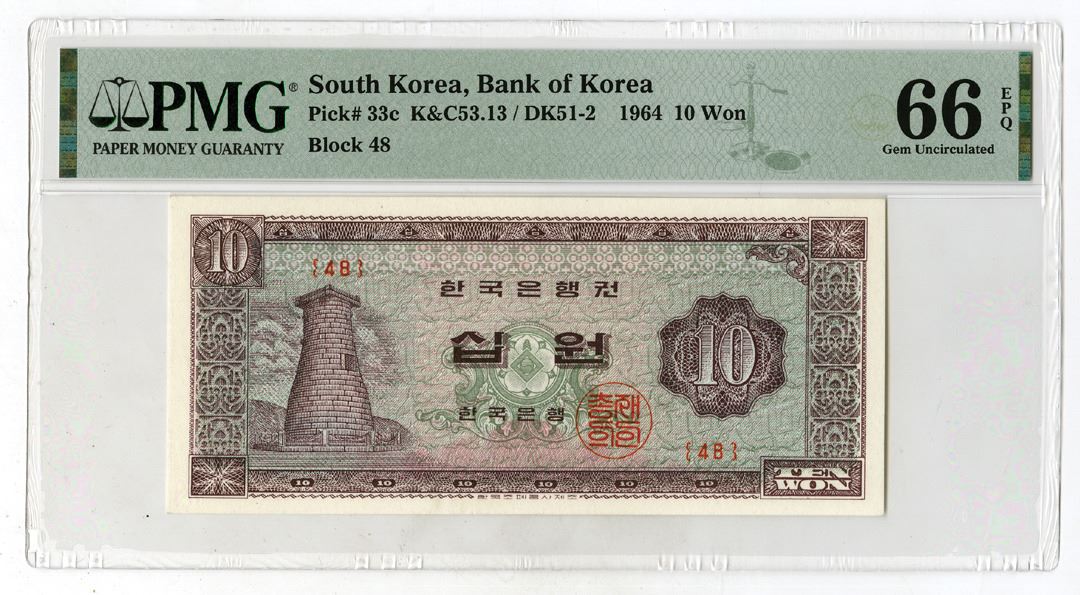 South Korea, 1964. 10 Won, P-33c K&C53.13/DK51-2, Purple on m/c underprint with stone tower at left, Back is purple on blue with turtle ship at center, Block 48, PMG graded Gem Uncirculated 66 EPQ.