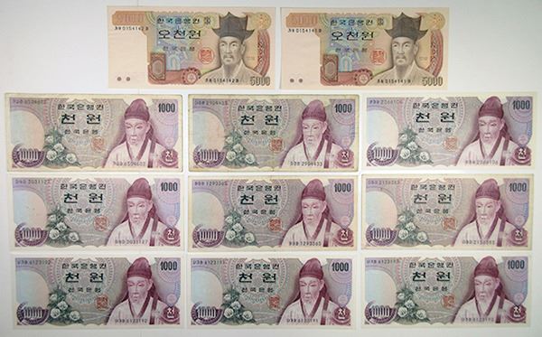 South Korea. Lot includes 5000 Won, 1977, P-45, Choice Unc; and eight pieces of 1000 Won, 1983, P-47, (2 Choice Unc, 2 Choice XF, and 3 F-VF). 9 pieces.