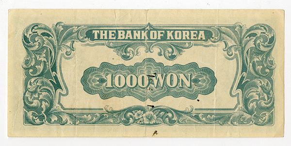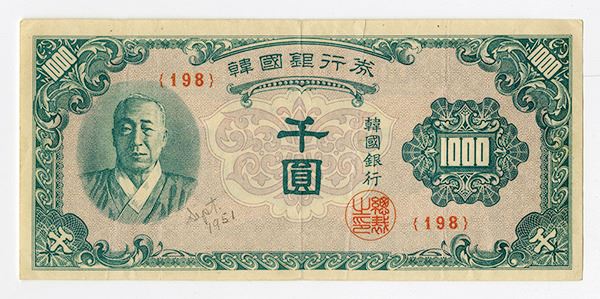 Korea. Issued 1000 Won, ND (1950), P-8, green color, Syngman Rhee at left, Very Fine.