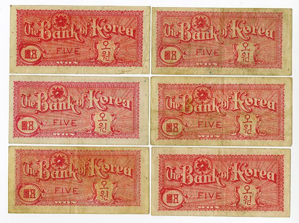 South Korea... Lot of 6 notes, all are 5 Won, P-12, Issued Banknotes, Red, all are Choice Fine to Choice VF, scarce note. Attractive assortment. (6).
