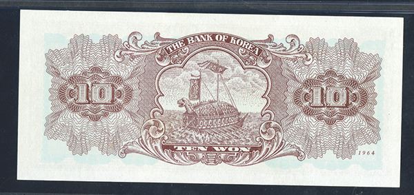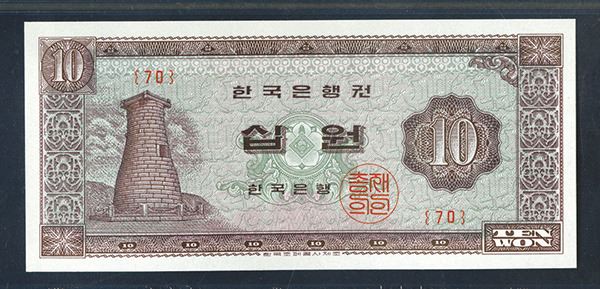 South Korea. Lot of 3 notes, all are 10 Won issues includes 1964, P-33c; 1965, P-33d and ND (1962-65), P-33e, All are PMG graded Gem Unc. 65 EPQ or 66 EPQ. Attractive high grade banknote trio. (3)