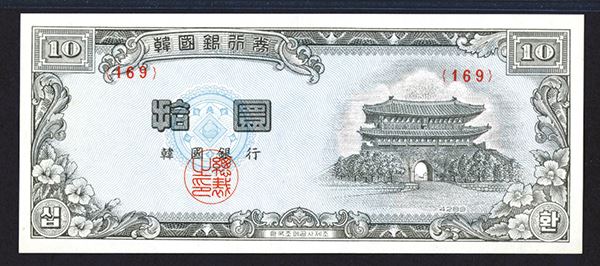 South Korea. Bank of Korea. 10 Hwan. 4289 (1956). Pagoda at right end, date below. SCWPM 17d. Graded PMG 65 EPQ.