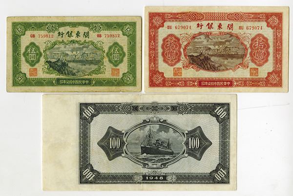 China. 1948, Lot of 3 issued notes, all backs with ocean liners at center, Includes 5 Yuan, P-S3446 S/M#K20-2, green and gray, mountain lake at center, back green, VF; 10 Yuan, P-S3447 S/M#20-3, red border on light blue undertint, brown mountain lake at center, back red, Choice VF to XF; and, 100 Yuan, P-S3449 S/M#K20-5, black on pale blue underprint, back black, Crisp Choice VF to XF. Rare and attractive banknote trio.
