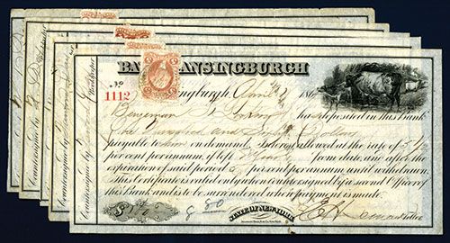 New York, 1864-1865, I/C, Checks Lot of 5, Black print with simple border and Cow vignette top right corner, 5cent Washington red revenue stamp attached, Fine-VF condition mixed lot, ABNC.
