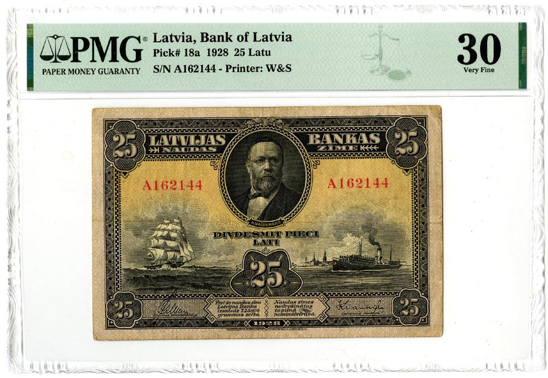 Latvia. 1928. 25 Latu, P-18a, Issued banknote, Black on yellow underprint, S/N A162144, PMG graded Very Fine 30. Printer: W&S