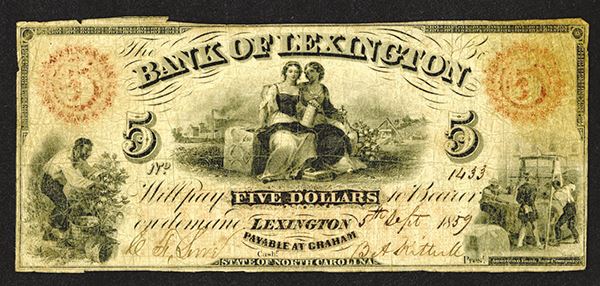 Lexington, NC (Payable at Graham), $5, Haxby NC30-G12a, Issued Obsolete, Black on red underprint, S/N 1433, VG, ABNC. Attractive note.