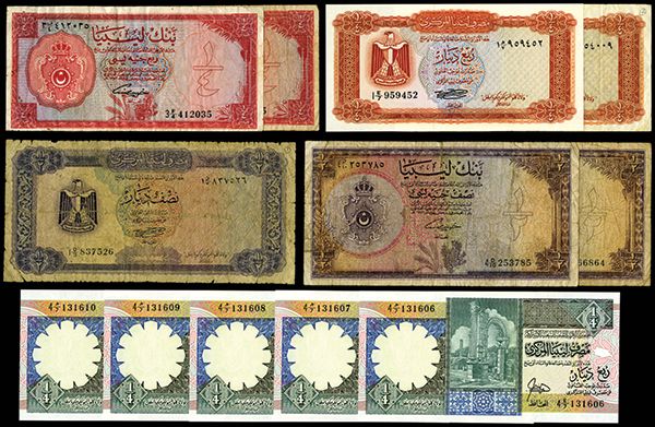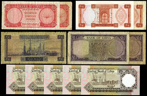 Bank of Libya, 1963-93, Group of 12 Libya, lot of 12, includes 1/4 Pound, P-23 (2 pcs); 1/2 Pound, P-24 (2 pcs); 1/4 Dinar, P-33b (2 pcs, one UNC); 1/2 Dinar, P-34; and 1/4 Dinar, P-57 (5 pcs, all UNC).