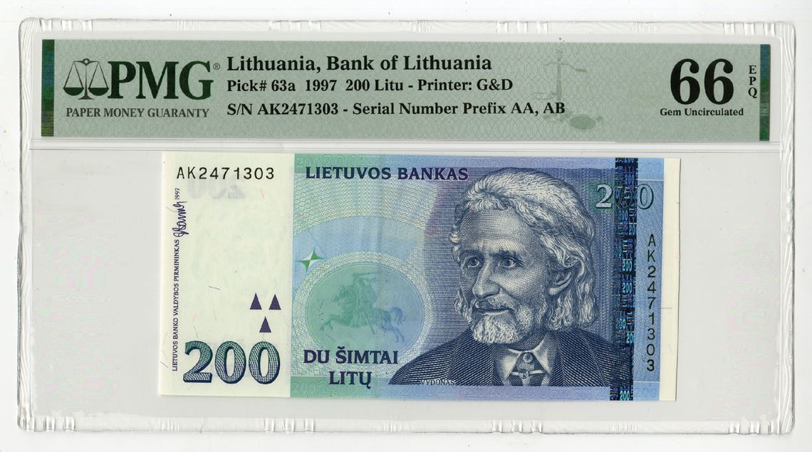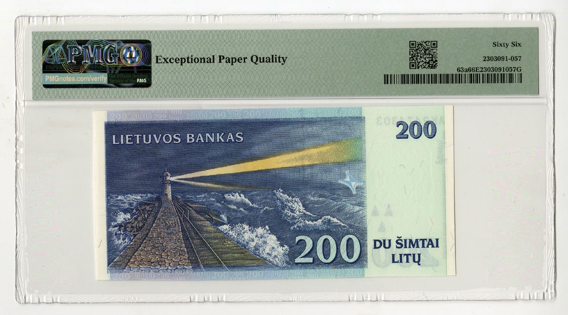 Lithuania, 1997. 200 Litu, P-63, Issued Banknote, Dark blue on blue and m/c underprint with Vilius Vydunas at right, Back is blue and m/c with lighthouse ay left, S/N AK2471303, PMG graded Gem Uncirculated 66 EPQ, G&D.