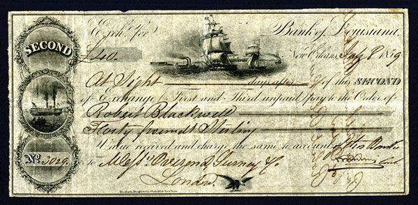 Issued Bill of exchange for 40 Pounds, black on parchment type of paper, sailing and steam ships in middle with steamboat on left counterfoil area, Issued to Robert Blackwell, VF condition, DW&C. Scarce variety.