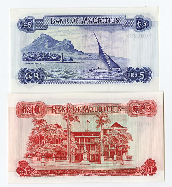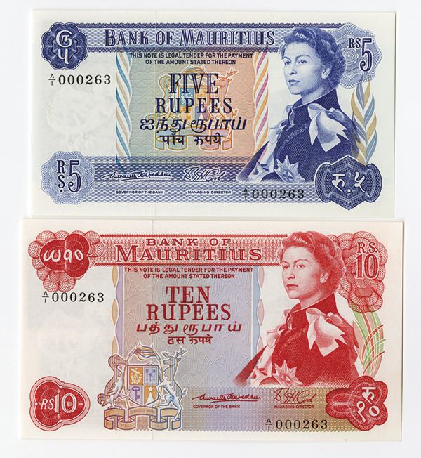 Mauritius. 5 Rupees, P-30a; 10 Rupees, P-31a, both Uncirculated. Both with the same serial number, A/1 000263.