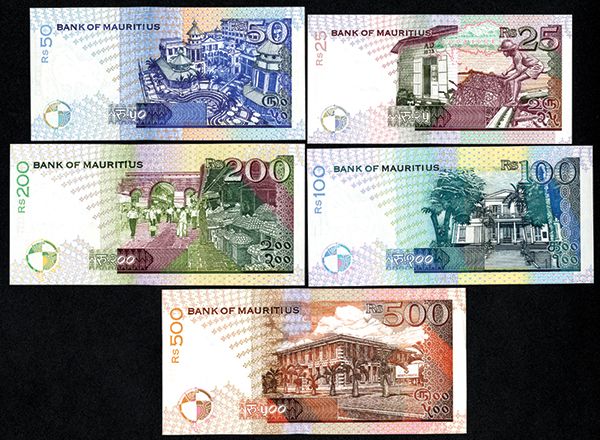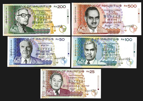 Bank of Mauritius, 1998 "Error" Issue Set of 5 Notes.` Mauritius, Lot of 5 notes, All are "Errors" from the same set that was withdrawn due to the arrangement of the denomination languages, the note should have been printed with English on top, Sanskrit / Tamil instead of the correct order of English / Tamil / Sanskrit. Includes 25 Rupees to 500 Rupees, P-42 to P-46 (Missing the 1000 and 2000 Rupees, all are in Choice to gem Uncirculated Condition.