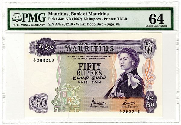 Mauritius. 50 Rupees, ND (1967) P-33c. Issued banknote, Queen Elizabeth II at right. Back shows ships docked at Port Louis Harbor. PMG graded Choice Unc 64. Purple on m/c underprint. (Cert # 5001941-011). TDLR.