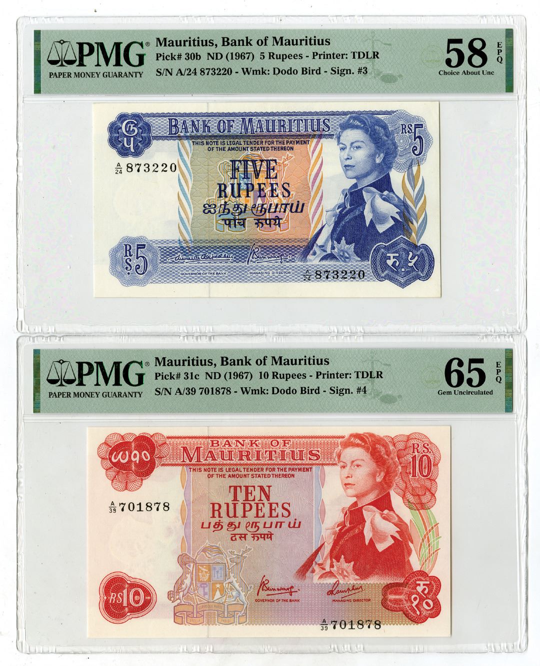 Mauritius, ND (1967). Lot of 2 Issued Banknotes, Includes: 5 Rupees, P-30b, Blue on m/c underprint with Queen Elizabeth II at right, S/N A/24 873220, PMG graded Choice About Uncirculated 58 EPQ; 10 Rupees, P-31c, Red on m/c underprint with Queen Elizabeth II at right, S/N A/39 701878, PMG graded Gem Uncirculated 65 EPQ. Both notes were printed by TDLR. (2). Sold "AS IS" no returns accepted.