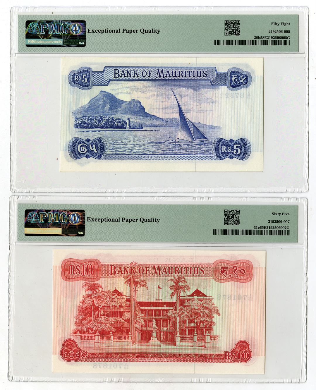 Mauritius, ND (1967). Lot of 2 Issued Banknotes, Includes: 5 Rupees, P-30b, Blue on m/c underprint with Queen Elizabeth II at right, S/N A/24 873220, PMG graded Choice About Uncirculated 58 EPQ; 10 Rupees, P-31c, Red on m/c underprint with Queen Elizabeth II at right, S/N A/39 701878, PMG graded Gem Uncirculated 65 EPQ. Both notes were printed by TDLR. (2). Sold "AS IS" no returns accepted.