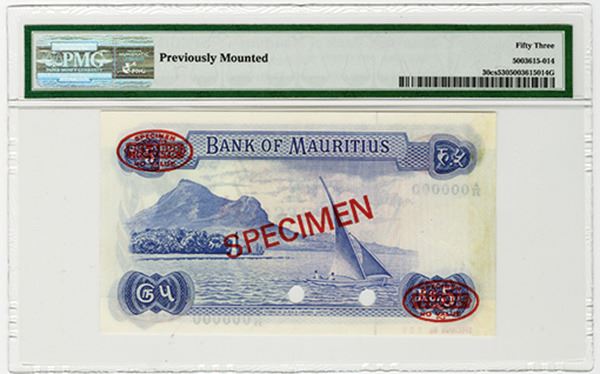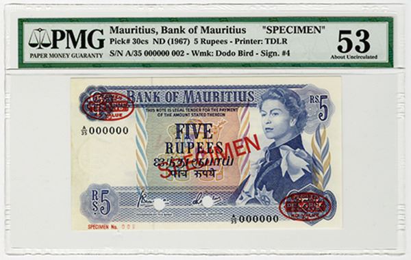 Mauritius. Specimen 5 Rupees, ND (1967), P-30cs. PMG graded About Unc 53 with comment "Previously Mounted" (Cert # 5003615-014). TDLR.